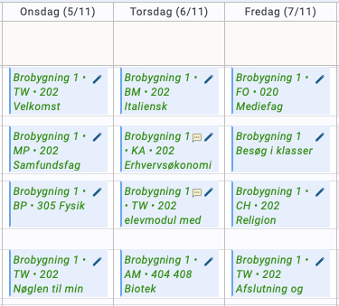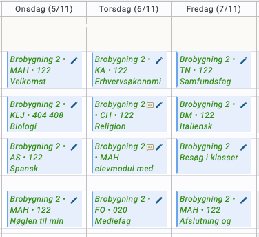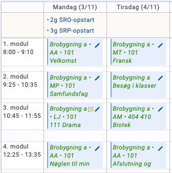 Vi starter normalt kl. 8.00, og vi har lektioner af 70 minutters varighed. Spisepausen afholdes kl. 11.55-12.25.